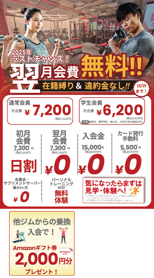 | オプション | 水素水サーバー / 月額1,100円 (税込) 有料ロッカー / 月額1,100円 (税込) サプリメントサーバー 代謝アップコース / 月額1,650円 (税込) ボディメイクコース / 月額2,750円 (税込) バルクアップコース / 月額4,400円 (税込) |