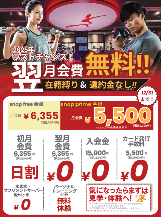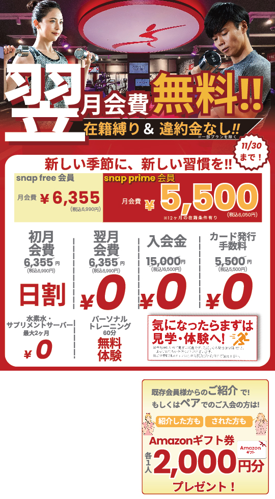 | オプション | 水素水サーバー / 月額1,100円 (税込) 有料ロッカー / 月額1,100円 (税込) サプリメントサーバー 代謝アップコース / 月額1,650円 (税込) ボディメイクコース / 月額2,750円 (税込) バルクアップコース / 月額4,400円 (税込) |
