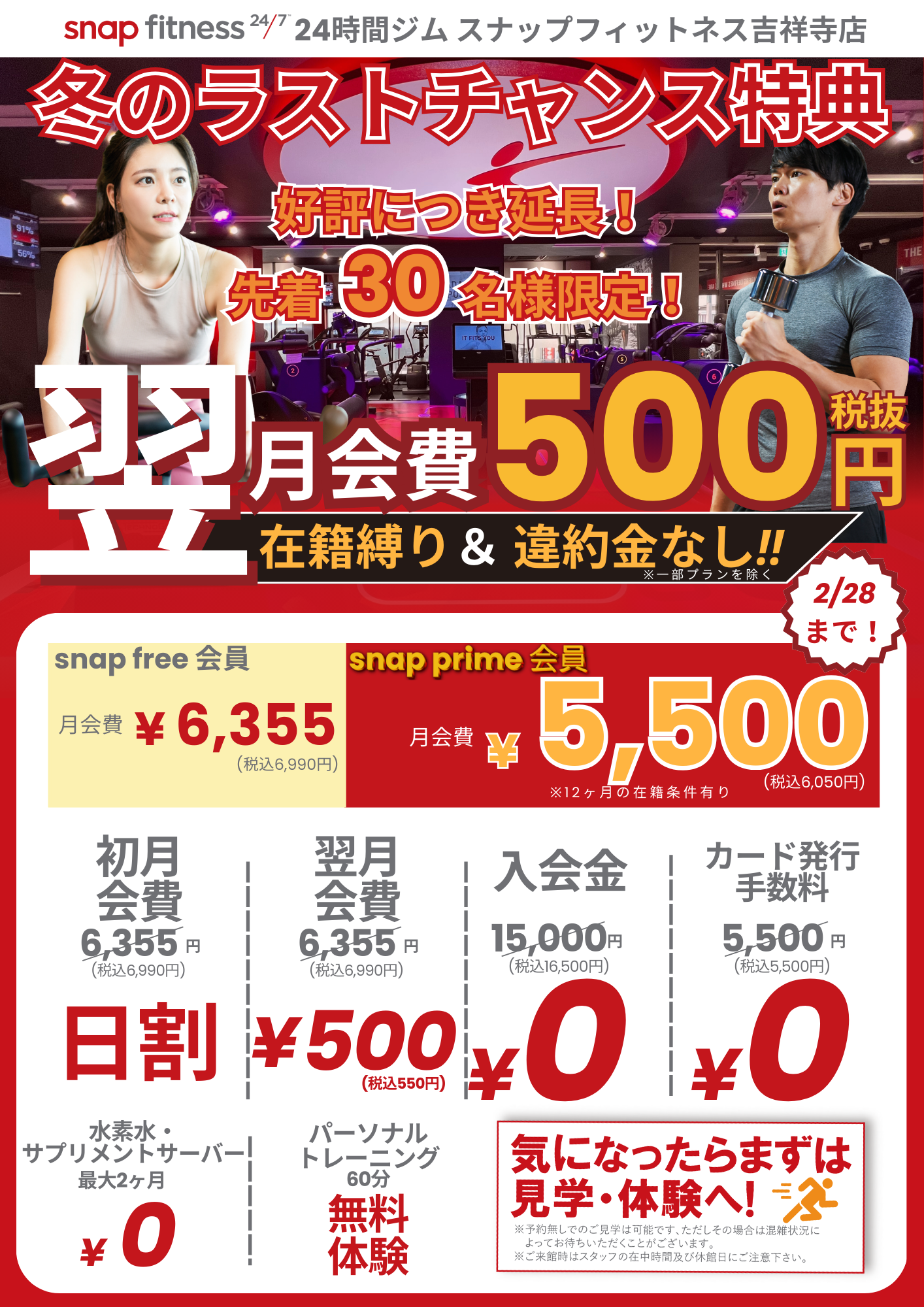 | オプション | 水素水サーバー / 月額1,100円 (税込) 有料ロッカー / 月額1,100円 (税込) サプリメントサーバー 代謝アップコース / 月額1,650円 (税込) ボディメイクコース / 月額2,750円 (税込) バルクアップコース / 月額4,400円 (税込) |
