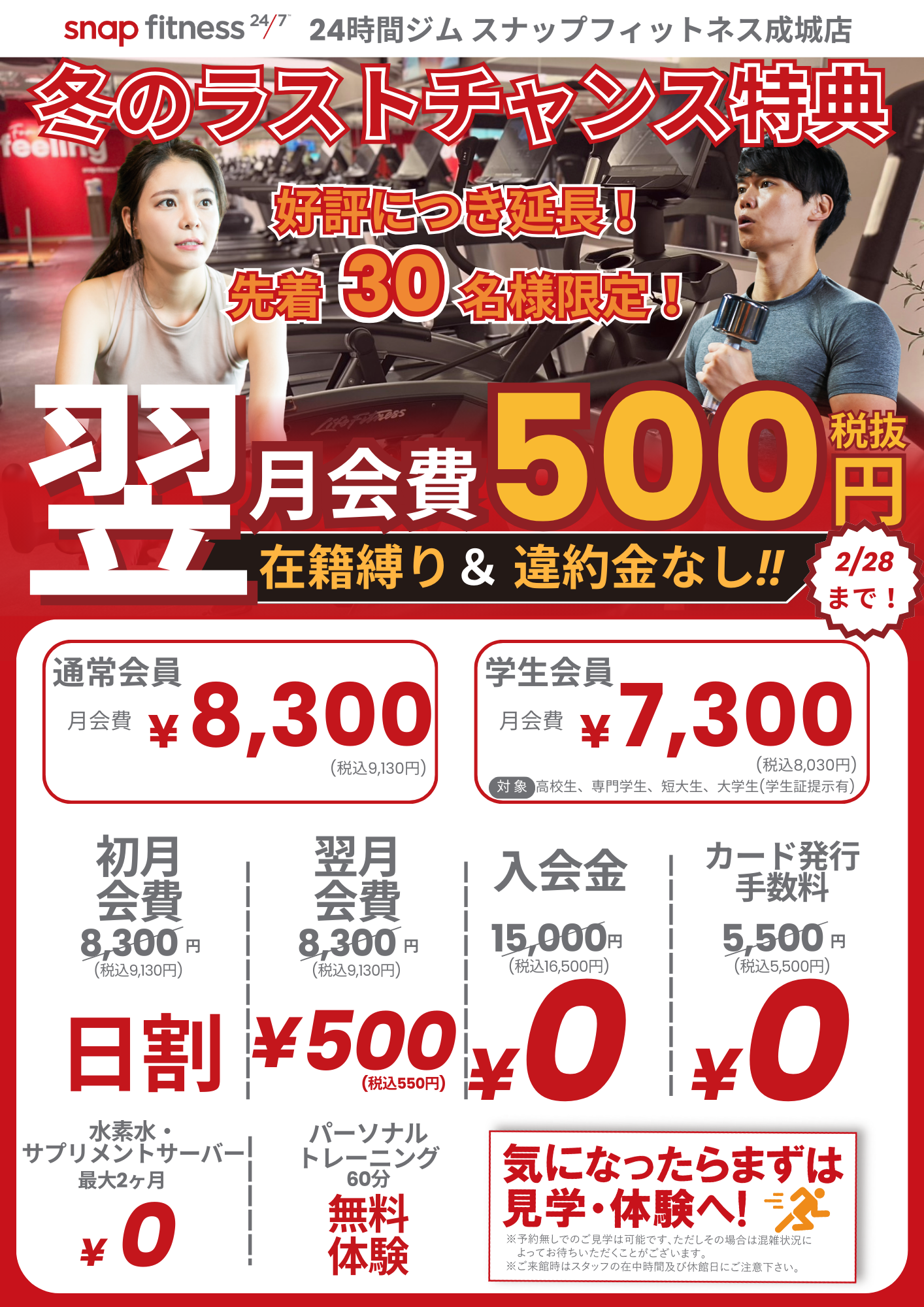 | オプション | 水素水サーバー / 月額1,100円 (税込) 有料ロッカー / 月額1,100円 (税込) サプリメントサーバー 代謝アップコース / 月額1,650円 (税込) ボディメイクコース / 月額2,750円 (税込) バルクアップコース / 月額4,400円 (税込) |